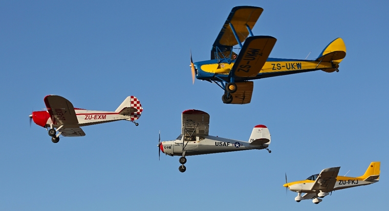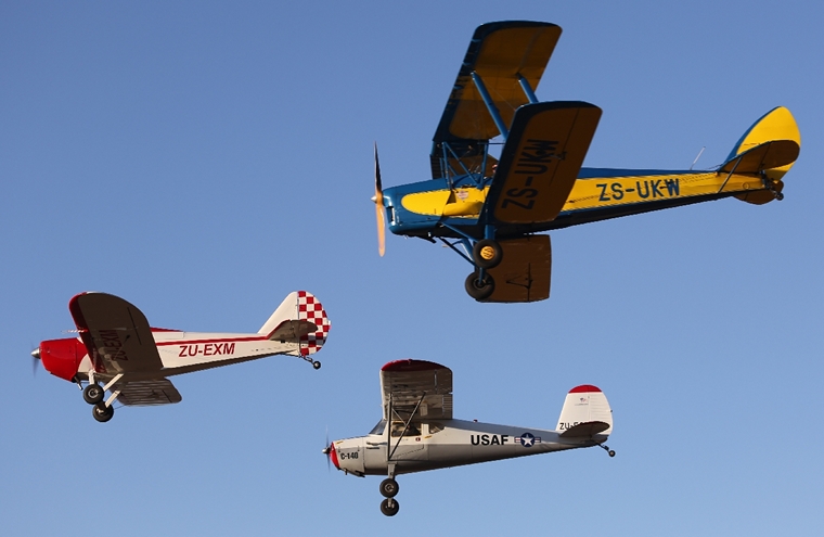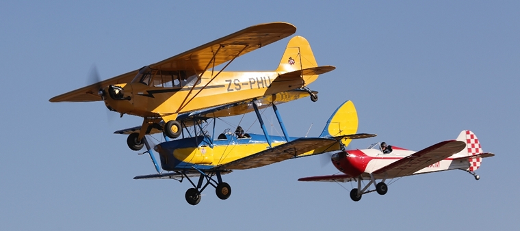 Formation flying was the order of the day the FlyBaby ZU-EXM the Tigermoth ZS-UKW and the Cessna 140 ZU-ECP took centre stage in entertaining the crowds.