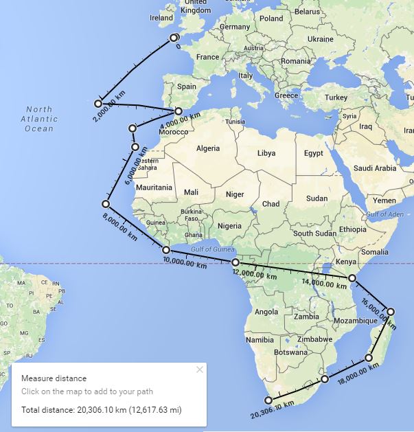 The distance travelled from Pembroke Dock to Langebaan Lagoon is 20 306 kilometers