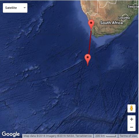 Google map illustrating that UIT-22 was sunk 939 km south of Langebaan