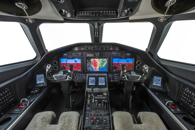 The three 14-inch landscape flight displays can function independently as a primary flight display or multifunction display. The displays also function in multi-pane mode, the centre pedestal for MFD control and two additional panels control each PFD. Pilots can customize displays via the touch screen control panels, organizing and prioritizing the flight data presented.