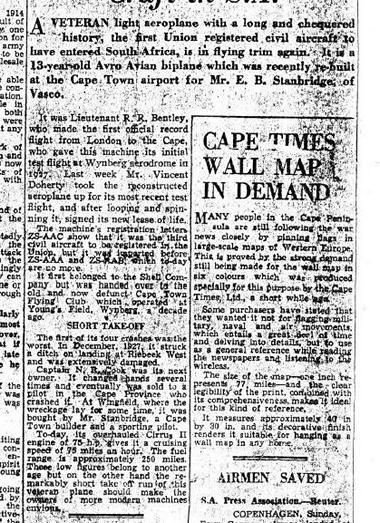 Report in the Cape Times of 6 October 1939 on the Avians flight after the restoration by Eric Stanbridge