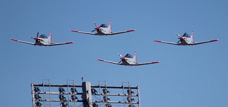 As the two 412's cleared the stadium the PC-7 display team made their run in from the direction of the parliament buildings. Flying low over the stadium they then pulled up in a vertical break with two aircraft rolling off the top of their loops back over their engaged audience.