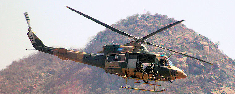 After the traditional opening parade and a welcome for President Ian Khama it was straight into the fun, starting with a mass flypast. Two flag carrying Bell 412's were closely followed by a large flag parachute jump from a Bel 412. The first highlight was the first public appearance of the BDF's Super Puma in Gaborone since its smart repaint as it came in escorted by two Eurocopter AS350's. The Super Puma has impressed so much that the local press has reported that the BDF expected to acquire another three of the type. This was then followed by a larger parachute jump from a CASA -235.