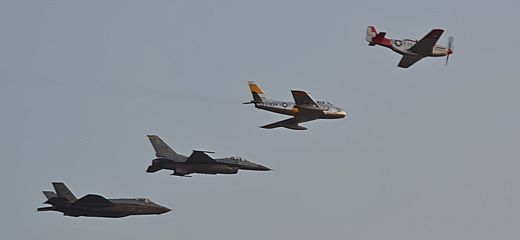 The Heritage Flight featuring modern fighter/attack aircrafts flying alongside WWII , Korean and Vietnam era aircraft. Flying the P-51 Mustang 'Valhalla ' was Lt.Col Greg Anders with Steve Hinton of Reno Air Race fame in the F-86 Sabre. Captain John Waters flew the F-16 Viper and Major Will Andreotta the F-35A Lightning.