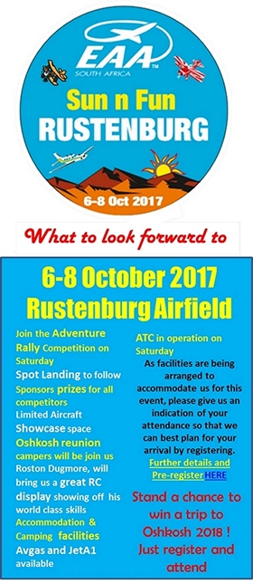 MIDWEEK UPDATE 20 SEPTEMBER 2017Plan Your Weekend……..Forthcoming Events…….Aviation News Worldwide Incidents and Accidents……This Week in Aviation History ![]() ![]() 3rd Saturday of every month. Microland. Bring and braai. Fires and bykos provided. Fires start from 09h30. Contact person: Nick Swardt 082 441 8011 or Alan Hussey 072 82 2341 ![]() 23: Witbank Aero Club: Please notify Robert Clark via SMS / WhatsApp (082 463 1372) or email Comms@flywaa.co.za how many people will be attending the fly-in. 23-24: Bara Bounce, Baragwanath Airfield. For more info go to www.jlpc.co.za 24: Durban Wings Club Fun Rally. Virginia Airport. Frank Eckard 083 269 1516 frank.eckard@mweb.co.za 23-24: Magaliesburg Gliding Club free complimentary breakfast fly in. Overnight facilities available. Contact jcadriaan@gmail.com for more info. ![]() 30: Secunda Flying Club Rally. Contact Jonty Esser e-mail: jonty@promptroofing.co.za Cell: 076 302 0451 ![]() 4: EAA Chapter 322 meeting. Dicky Fritz Moth Hall Edenvale. Contact: editor@afskies.co.za 6-8: EAA Sun 'n Fun, Rustenburg. Contact Marie ReddyE-mail: marie.reddyy@gmail.com Cell: 083 259 7691. To register: https://docs.google.com/forms/d/e/1FAIpQLScfICuVG5JBmzfcIP_LUbA46OL3O2FJ-r5qY7bWTLfjNMi26w/viewform ![]() 7: Polokwane Airshow. Tel: 015 288 0122 Contact Oupa Mamabolo. Cell 082 605 3261. E-mail oupa.mamabolo@gaal.co.za 21-22: SAC Free State Regionals. Tempe airfield. Contact Annie Boon e-mail: chunge@mweb.co.za 3rd Saturday of every month. Microland. Bring and braai. Fires and bykos provided. Fires start from 09h30. Contact person: Nick Swardt 082 441 8011 or Alan Hussey 072 82 2341 24-26: African Airshow. Kotoka International Airport Ghana. Contact Jade Myburgh at +971 2 4192714 Website: www.africanairshow.com 27,28 & 29: Oudshoorn Aeroclub Fly in. Braais, Fly-outs, live music, free shuttle service no landing fees and discount on Avgas. Contact Morne Jonker 062 429 5614 mornejonker @rocketmail.com ![]() 1: EAA Chapter 322 meeting. Dicky Fritz Moth Hall Edenvale. Contact: editor@afskies.co.za ![]() 4: Aero Club of South Africa annual awards evening. Contact: Sandra Strydom Tel: 011 082 1100 E-mail: office@aeroclub.org.za 11: Peter Hengst Memorial Adventure Rally Brits EAA Adventure Rally-Brits. Contact Rob Jonkers 082 804 7032 rob@aerosud.co.za for Rally information and entries and Trixiie Heron editor@afskies.co.za for EAA 18: Baragwanath Fun Rally. Contact Frank Eckard 083 269 1516 frank.eckard@mweb.co.za 3rd Saturday of every month. Microland. Bring and braai. Fires and bykos provided. Fires start from 09h30. Contact person: Nick Swardt 082 441 8011 or Alan Hussey 072 82 2341 ![]() 2-3: SAC Ace of Base Vereeniging. Contact Annie Boon E-mail: chunge@mweb.co.za 6: EAA Chapter 322 meeting. Dicky Fritz Moth Hall Edenvale. Contact: editor@afskies.co.za 9: SAAF Silver Falcons 50th anniversary airshow. AFB Langebaanweg, Western Cape ![]() The Aviation Radio Show; get all your questions answered in one place. To listen to a recording of the live broadcast click on the link: www.debela.co.za/aviation-radio-show ![]() EXCALIBUR LIGHT SPORT AIRCRAFT The Excalibur is available in the US amateur-built and light-sport aircraft categories and in Canada in the amateur-built, BULA and AULA categories. In Europe it qualifies under the Fédération Aéronautique Internationale microlight rules. The Excalibur was designed as "clone" of the Quad City Challenger II aircraft. The company took the basic Challenger design and incorporated many changes, including mounting the engine upright allowing larger propellers and the Rotax gearbox to be mounted, lengthening the tailboom and enlarging the tail vertical surface to increase stability, shortening the ailerons and replacing control cables with torque tubes. The optional Dacron covering on the Challenger was replaced with Superflite standard aircraft fabric, the fuselage was lengthened to give more backseat room and the nosecone was reduced in size to provide better over-the-nose visibility. The design was also streamlined to reduce drag and round cross-section wing struts were replaced with aerodynamic extrusions. The Challenger's rigid landing gear was replaced with a bungee-suspended system. THE BREITLING DC-3 WRAPS UP ITS WORLD TOUR ![]() Photo © Breitling ![]() The crew and certain privileged passengers were not the only ones to have flown aboard this veteran of the conquest of the skies. To mark the event, Breitling had also created a limited edition of its famous Navitimer aviation chronograph, the cult watch among pilots and aeronautical enthusiasts since 1952, and decided to have it travel around the world in the Breitling DC-3, thus ensuring it is truly part of this adventure and that it shares every stopover, as well as the finest airborne moments. The 500 Navitimer "Breitling DC-3 World Tour" chronographs will be delivered to their lucky owners with a logbook signed by the captain notably listing all the takeoff and landing times, flight times, the names of the pilots as well as the weather conditions of each stage. A graphic means of reliving step by step the entire odyssey of both the plane and the watch. MAJOR CHANGE APPROVAL FROM EASA FOR G1000NXI P2006T MKII ![]() Photo © Tecnam This year at AERO Friedrichshafen Tecnam announced a major upgrade to its best- selling P2006T next-generationTwin. With P2006T Twin's operating in 40 countries worldwide, it is already firmly established as the twin aircraft of choice by both leading Flight Training Organizations and private owners alike. The P2006T Twin MkII offers unbeatable value, coupled with low operating and ownership costs, innovative design and Italian styling. The Rotax '912S3' allows the Tecnam P2006T to lead with respect to the environment too. With both a remarkable fuel saving offering and much lower noise emissions, it has redefined both the flight training and aircraft ownership experience in one step. The P2006T Twin MkII features a number of