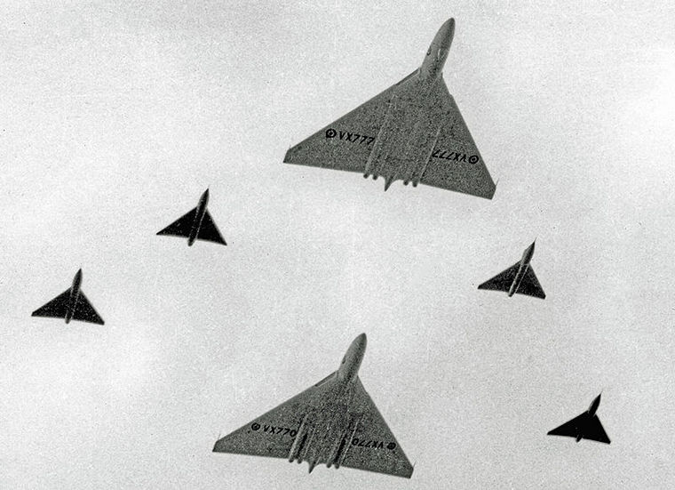 The Avro 707s made public appearances at the Farnborough Airshows in both September 1952 and 1953. In 1952, the first prototype Vulcan flew with the 707s A and B and in 1953, the four surviving 707s flew alongside the first two Avro 698 Vulcan prototypes.