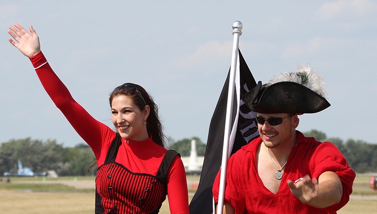 In 2008, Kyle and wife Amanda introduced Captain Kyro and Scandalous Scarlett in their Pirated Skies act and brought a new dimension to airshows. For three seasons their airborne sword fights and Amanda's daring wing walking thrilled the crowds wherever they went.