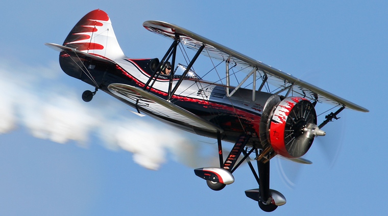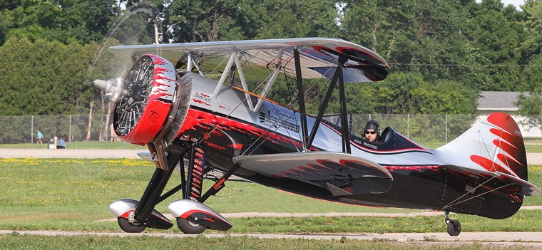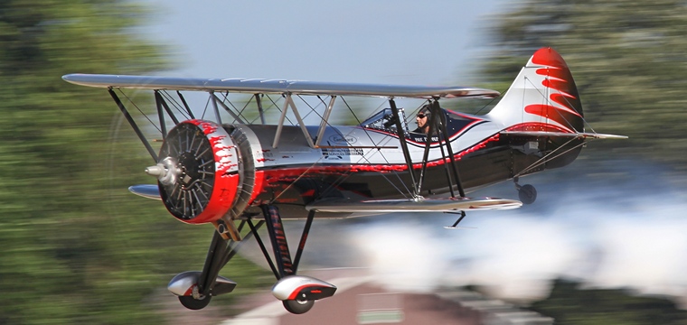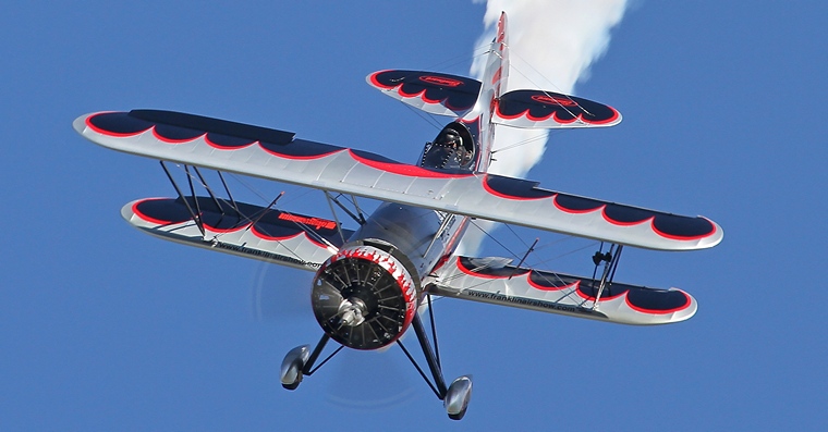 The aircraft chosen for the act was the iconic Waco Mystery Ship. The pleasing lines of the biplane were further modified; the tapering fuselage, speed ring cowling, and sloped windshield hearken back to the racing airplanes of the 1930's.