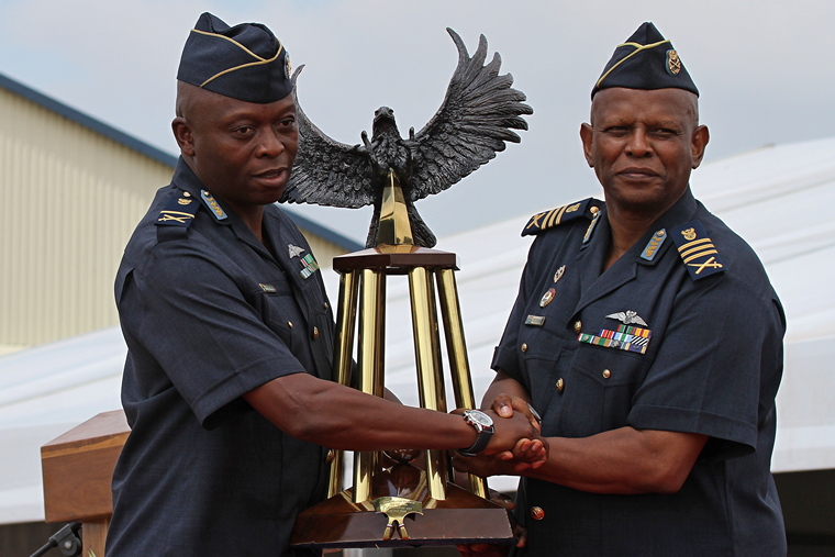 The Prestige Awards recognise exceptional performance among units, bases and directorates in the SAAF and this year AFB Langebaanweg were the winners. Brigadier General Matanda receiving the award from General Msimang.