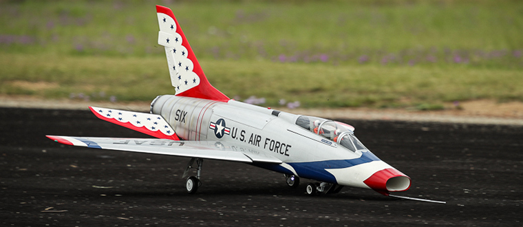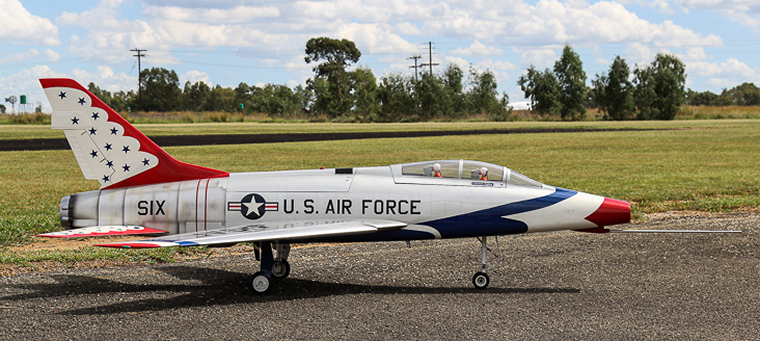 Another R/C jet that had a slight front-wheel undercarriage malfunction during landing was the Super Sabre in spectacular livery as flown overseas at full-size air shows. This model R/C jet presents truly realistic to being full size when seen from close-by, even on the ground in static display format.