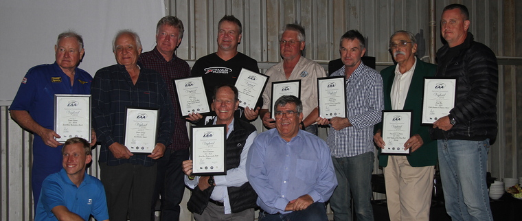 Front Row (left to right): Best Restoration Keeton Perkins-Decathlon, Best Professionally Build Pierre Dippenaar Van RV4, Paul Lastrucci National President EAA of SA.Back row: Best Restoration Dennis Spence-Decathlon, Best Warbird Eugene Couzyn-Gazelle, Best LSA Wayne Giles-Bearhawk LSA, Best Rotorcraft Andreas Hohne -Titanium, Best Wood Aircraft Dale de Klerk-CA-61 Mini Ace, Best Scratch Build Stewart Clegg-Jodel, Best Plans Build Dries Janse van Vuuren- Tailwind. Concours de Elegance Craig Mee-Carbon Cub. Absent Best Rag and Tube Dirk Coetzee-Pitts Special
