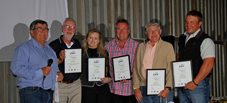Left to right. Paul Lastrucci National Presidents of the EAA of SA, Nigel Musgrave for his contribution to promotion of safety in general aviation, Rene Clulow for hosting the ladies program, Horace Blok for the longest distance travelled, Claus Keuchel for being the oldest flying member to attend and Morne Strauss for his outstanding contribution to the 2018 convention