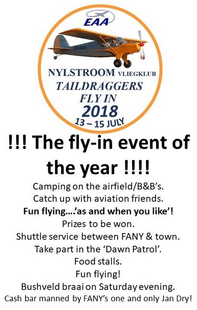MIDWEEK UPDATE 20 JUNE 2018Plan Your Weekend……..Forthcoming Events…….Aviation News Worldwide Incidents and Accidents……This Week in Aviation History ![]() ![]() 3rd Saturday of every month. Microland. Bring and braai. Fires and bykos provided. Fires start from 09h30. Contact person: Nick Swardt 082 441 8011 or Alan Hussey 072 82 2341 23: Potchefstroom charity event fly-in breakfast to raise funds for cancer sufferer four year old Ruben Bamberger. 24: Vintage Aircraft Fly-in Johannesburg Model Aircraft Club. JOMAC is just off the R 114 Mulderdrift Road and is registered with SAMAA at 25° 56' 31" S and 27° 58' 44" E. Contact: jomacadmin@gmail.com 24-28: South African Hot Air Balloon Championships 2018, Skeerpoort North West Province. Contact Richard Bovell richard@bovellross.com 28 June- 1 July: Race for Rhinos - Sowa Pan - Botswana. Contact Chris Briers e-mail: chris@airteam.co.za cell: 082 568 7988 30: Wings Park Open Day and Fly-In. Contact Johan Odendaal odendaalj@italtile.co.za ![]() 4: EAA Chapter 322 meeting. Dickie Fritz Moth Hall Edenvale. Contact: editor@afskies.co.za 6-10: Zim Navex - Prince Charles Airport - Harare. Marion Kalweit - 2017 Air Rally Committee email: zimairrally@gmail.com Tel +263772570009 ![]() 7: SAAF Museum AFB Zwartkop open practise day. Officer Commanding - Museum oc@saafmuseum.org.za 012 351 2290 9: MISASA AGM 18h00 at Kroon Airfield 14-16: Nysltroom Vliegklub/EAA Taidraggers Fly in for more information contact: Richard Cell: 082 490 6227 or mail to: Richard.nicholson1963@gmail.com 14: SAC Judges Trophy. Brits Airfield. Contact Annie Boon chunge@mweb.co.za 14: Hoedspruit Fun Rally. Contact Wynand Uys email: wynand@ottersden.co.za or Frank Eckard e-mail: frank.eckard@mweb.co.za cell: 083 269 1516 14: Limpopo Flying School Open Championships for Microlights. Camping facilities at the field. For more information contact Nico at 0828525961 or email vliegskool@hotmail.com 21: Krugersdorp Flying Club Airfield Festival and spot landing competition. Contact kfc@iafrica.com or phone 082 374 5559 21: Tailwinds fly-in at Microland. Contact Nick Swardt : Nick Swardt 082 441 8011 23 -29: EAA AirVenture Oshkosh, Wisconsin, USA Camping on the airfield contact Neil Bowden E-mail: neil1@telkomsa.net Hotels in Appleton contact Calvin Fabig E-mail: calvin@designer.co.za 28: CAA Safety Campaign Launch Midrand Conference Centre. RSVP Kgomotso Malema at malema@caa.co.za ![]() ![]() 4: SAAF Museum AFB Zwartkop open practise day. Officer Commanding - Museum oc@saafmuseum.org.za 012 351 2290 3rd Saturday of every month. Microland. Bring and braai. Fires and bykos provided. Fires start from 09h30. Contact person: Nick Swardt 082 441 8011 or Alan Hussey 072 82 2341 9: Stellenbosch Flying Club Women's Day Fly in. Contact Alison Navarro 083 728 78386 architecnic1953@gmail.com or Louise Hofmeyer 083 454 1104 louise@airshowsa.org.za 19: Rand Airport Airshow. Contact Stuart Coetzee E-mail: manager@randairport.co.za Tel: 011 827 8884 19: World Helicopter Day. Henley Air Rand Airport. 25: Sheila Taylor Fun Rally - Krugersdorp Airfield. Contact Grant Rousseau Cell: 082 329 3551E-mail: gr@kama.co.za 25 - 25: Bethlehem Airshow Stefan Fourie fouriesj1491@gmail.com 072 344 9678 ![]() The Aviation Radio Show; get all your questions answered in one place. To listen to a recording of the live broadcast click on the link: www.debela.co.za/aviation-radio-show ![]() MORE THAN 10 PILOTS AND A WHOLE LOT OF HOT AIR! by Sarah Bauling What happens when you put 10 hot air balloon pilots into the sky all at once? The South African Hot Air Balloon National Championships! ![]() So who are these amazing pilots? What are their REAL jobs? And WHY are they envied by many? With the newest pilot in the competition sporting just 100 hours right up to the competitor with just over 2000 hours there is bound to be some fun! Competitors are coming from around the country - Johannesburg, Drakensburg and not forgetting our neighbours, Zimbabwe! Past South African champions, and those that simply love the camaraderie of ballooning. Full time pilots, part time pilots, retired passionate aviators hang gliders, maize and mielie and soya farmers, chartered accountants - you name it - they are there. Nine men, one lady, R35,000 worth of prizes and the grand title up for grabs - we can guarantee one thing - it is going to be unbelievable! SUBSONEX PERSONAL JET APPROVED FOR RENO AIR RACES ![]() Sonex Aircraft announced a collaboration with High Performance Aircraft Group to showcase the SubSonex Personal Jet. High Performance Aircraft Group debuted the SubSonex at this year's Pylon Racing Seminar (also known as "Rookie School") at Reno Stead airport in preparation and training for the National Championship Air Races in September. Photo © Sonex. "The plane has been approved for racing, and now we have to get to work in preparation for training enough pilots to create a new race!" remarks Pete. "I believe we got eight flights in and everyone loved it. It was a blast on the course." During the four-day event, the SubSonex participated in formation flights with as many different aircraft as time allowed. This included fingertip, echelon, cross-unders, pitch out rejoins and recoveries. Due to runway construction at Stead airport, only Saturday and Sunday were available for track time during this year's PRS. Very high winds prevented all flights on Saturday, so all time on the track had to be accomplished on Sunday. "I did three flights on the track and everyone loved the SubSonex," writes Pete, "First time in history for this jet design to make flights on the Reno race course!" Flights during PRS were conducted on the Jet/Unlimited course; however, Sonex Aircraft and High Performance Aircraft Group are hoping to gain approval for future testing and exhibition racing on the shorter courses, designed for aircraft closer to the SubSonex's speed envelope and level of manoeuvrability. ![]() Zaccagnino is flying SubSonex model J