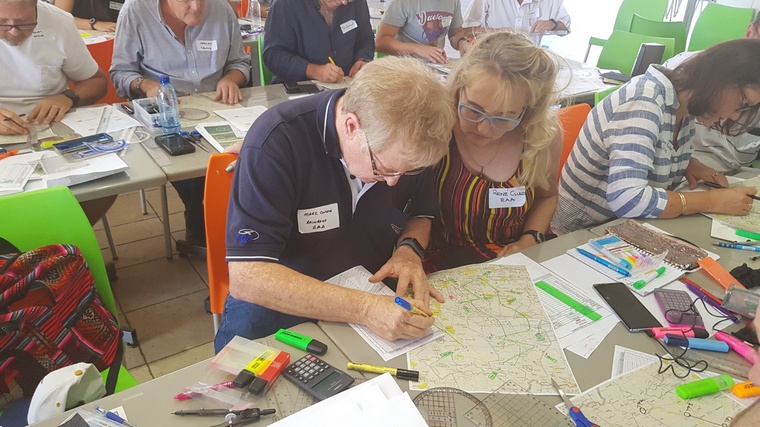 The morning's training ended off at around 11 am, and after a short break, everybody got their first route in an envelope, got the laminated transparent tool, which they had to cut out, and proceeded to plot each of the turn points making up the route. It was decided to proceed right through lunch, and most had finished their plot by after 2pm. The course was ended off with an in cockpit video of one of Rob & Martin's 2012 rally flights to show how the leg photo features match up with the real world outside to give the perspective of what one sees outside the cockpit from the flying height and distance.