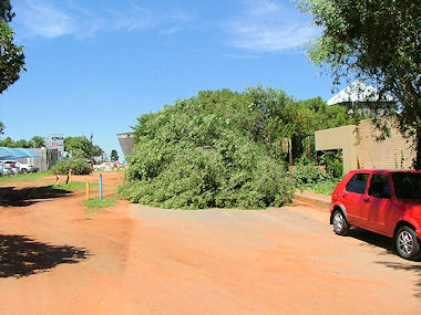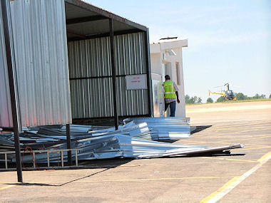 Even on the road towards the airport it was clear that this was not just a breeze as trees were uprooted and lying on the road while pieces of wrinkled hangar sheeting told the story.