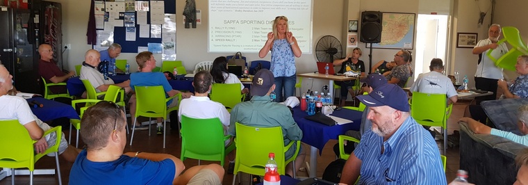 Mary de Klerk had arranged to hold a training session on how to fly a Speed Rally in the afternoon, which was very well attended and included a practical map preparation session on an sample map. Mary shared many the tips and tricks of how to follow the map features and timing points. Thereafter at 6h30, Rob Jonkers took to the stage and provided a briefing on what to expect for the next day in terms of the planned route, how many turn points, distance, departure and arrivals protocol as well as how the scoring system would work with the expected weather conditions, which looked as if some uncharacteristic rainy weather may appear.