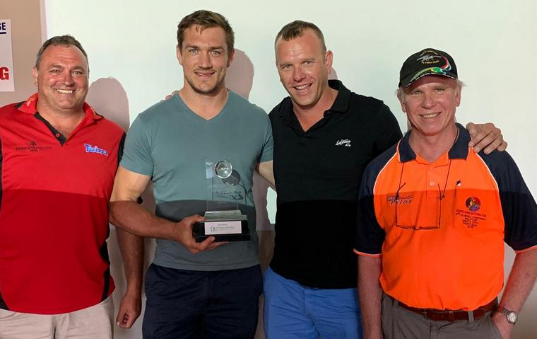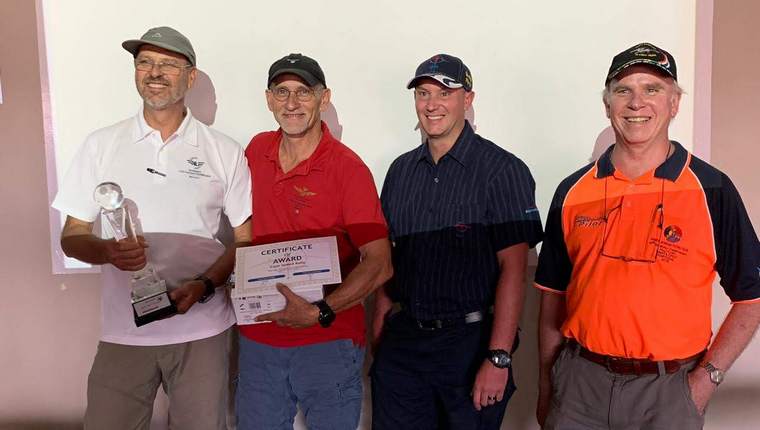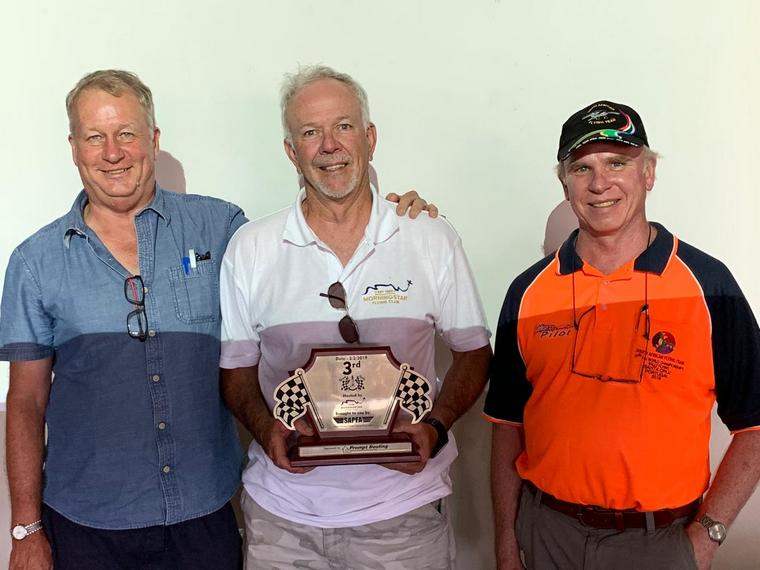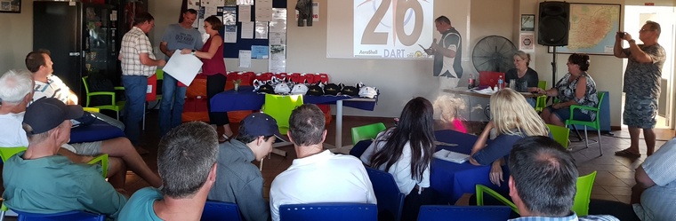 The results were completed by around 13h45 and prize giving commenced at 14.15 pm. The first up on the prize giving programme was to show some of the interesting tracks and given the weather conditions, showed how many had to divert around it. There were the odd few that went wandering off course in the good weather area which had the audience in fits of laughter. Jonty first handed over the host club floating trophy to Club Chairman Ross Leighton after which the placings for the best handicap speed and thereafter the most accurate / shortest route flown.