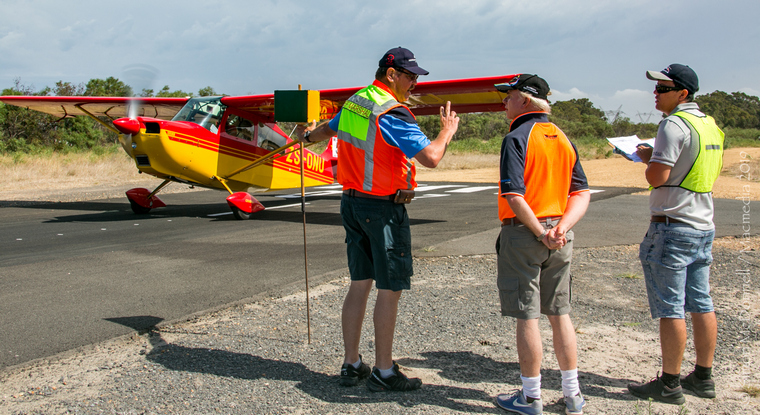 Scrutineers Chareen, Ray and Frans (Pilot Insure) were on hand to seal up all portable GPS capable devices, and also handing out papers at the allotted time. To assist the teams at getting their take-off roll accurate, a starting colour panel was used, which was set up next to the start line on the runway, which would release them at their allotted time slot. Each team then received their envelopes with their loggers at their 20 minutes prior take-off time, and the teams taxied to the starting line. 1st take-off was at 10h15 for the slowest aircraft and last take-off at 10h50 with the planned arrival at 11h30. The nippy RV8 ZU-FHM would only need 40 minutes to complete the course.