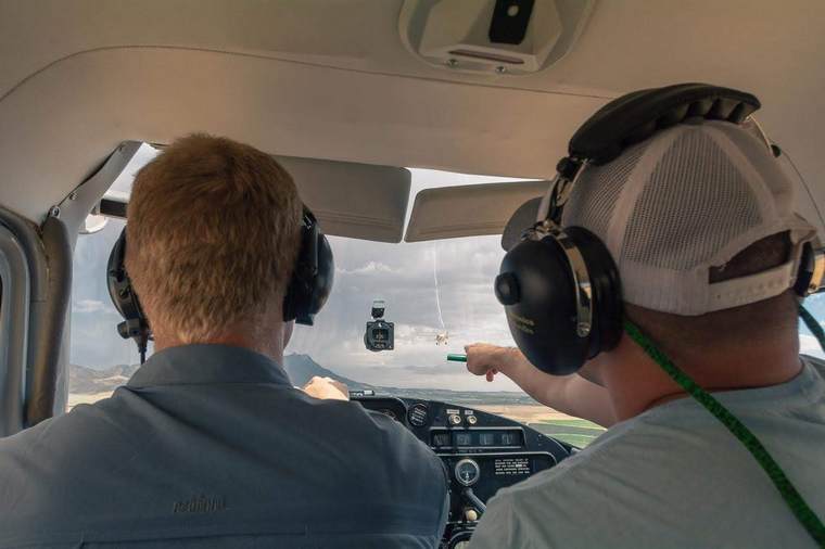 The team Rhett Shillaw and Cameron Sparg in ZS-MLE pointing out - "Follow that Plane"