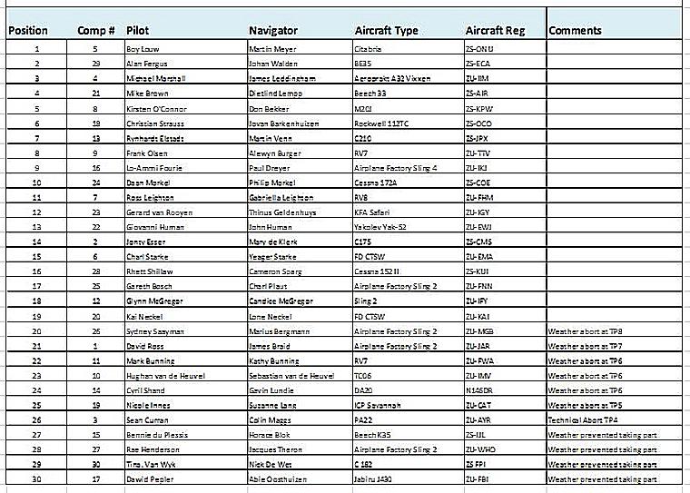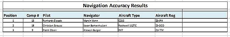 The overall winners in the best handicap speed were the team of Boy Louw and Martin Meyer in a Citabria ZS--ONU, in second place was Alan Fergus and Johan Walden in their Beach V35B ZS-ECA, and in third place Michael Marshall and James Ledingham in a Foxbat A32 ZU-IIM. The first three placings were the only crews who managed a clean penalty free round.