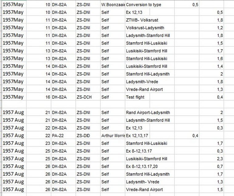 So on 10th May 1957, I got one of my flying Instructors, 'Bill' Boonzaaier, to convert me to ZS-DNI. ZS-DNI had a maroon fuselage then, with silver wings and the original stock-standard flight instruments as built. The only communication possible was the Gosport tube between the two seats.