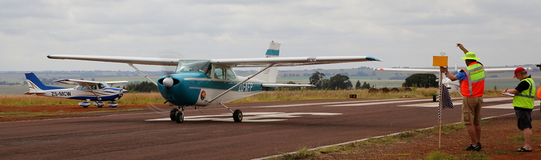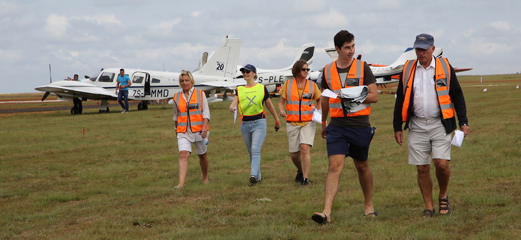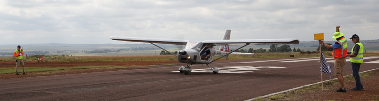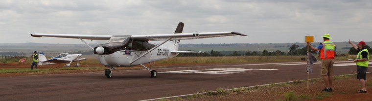 Scrutineers Chareen, Lizelle, Jean, Conrad, Frans and David were on hand to seal up all portable GPS capable devices, and also handing out papers at the allotted time time while simultaneously also checking that the fuel tanks were full. To assist the teams at getting their take-off roll accurate, a starting colour panel was used which was set up next to the start line on the runway by Chief Marshal Hans Potgieter and Mark Clulow, which would release them at their allotted time slot. Each team then received their envelopes with their loggers at their 20 minute prior to take-off time, and then taxi to the starting line within 10 minutes of take-off time. 1st take-off was at 09h55 for the slowest aircraft and last take-off at 10h50 with a planned arrival at 11h30. It was calculated that the fast Cirrus ZS-ACA would only need 40 minutes to complete the course.
