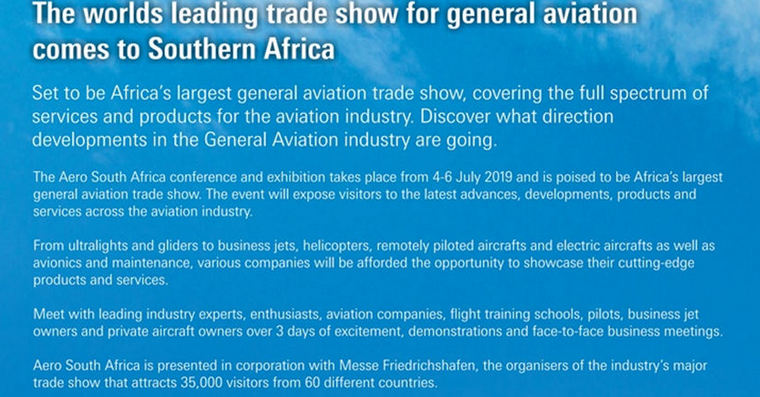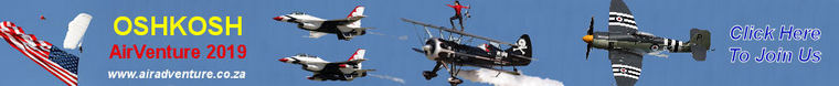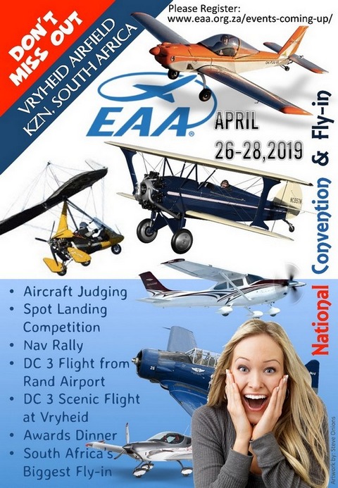 MIDWEEK UPDATE 3 APRIL 2019Plan Your Weekend……..Forthcoming Events…….Aviation News Worldwide Incidents and Accidents……This Week in Aviation History ![]() ![]() AERO-SOUTH AFRICA EXHIBITION Dear Aero Club Member, herewith an invitation to attend AERO South Africa taking place at Wonderboom National Airport on 4 - 6 July 2019. AERO South Africa is a general aviation, business to business expo modelled on Europe's biggest general aviation show, AERO Friedrichshafen. With the specific focus areas of AERO South Africa, it makes perfect sense for Aero Club Members to participate. Members receive a special discount on space booked. The Aero Club, representing a wide cross section of Recreational Aviation, has been endorsed by AERO South Africa. To take part or visit, contact details for AERO South Africa or the Aero Club is given below. We'll see you there! ![]() ![]() ![]() ![]() ![]() ![]() ![]() ![]() ![]() ![]() ![]() ![]() ![]() ![]() 6: Coves Fly in Carnival: All aircraft types are welcomed to visit for the day as long as they abide by the Coves Aero Club rules, approach procedures and the indemnity requirements laid out on www.thecoves.co.za, or available from aviation@thecoves.co.za. All arriving aircraft must complete on their arrival indemnity forms by no later than the 5th of April to gain access to our private airfield. Please email all forms confirming your understanding and possession of the rules of the day to The Coves Aero club chairman. JP Fourie, at aviationdirector@thecoves.co.za. 6: Robertson Annual Breakfast fly in. Contact Alwyn du Plessis cell: 083 270 5888 e-mail: boeredata@breede.co.za 6: SAAF Museum AFB Zwartkop open practise day. Officer Commanding Museum oc@saafmuseum.org.za 012 351 2290 6: SAAMA Pre-Nationals RC Pylon Racing at RMAC. To enter for the event go to www.pylonracing.co.za ![]() ![]() 4-14: Stars of Sandstone Ficksburg, Eastern Free State. Contact www.starsofsandstone.com 10-13 April: AERO Friedrichshafen, Germany Global show for General Aviation. Contact Stephan E-mail: stephan.fischer@messe-fn.de 19: Witbank Aeronautical Association fly-in Easter breakfast. Contact Robert Clark for more information. Comms@flywaa.co.za 26-28: EAA National Convention Vryheid KZN. Contact Marie Reddy 083 259 7691 Register at: www.eaa.org.za/events-comin-up/ 27: SAPFA EAA Convention Adventure Rally - Vryheid. Contact Rob Jonkers cell: 082 804 7032 e-mail: rob@aerosud.co.za 27 & 28: SAC Judges Trophy venue TBA. Contact Annie Boon e-mail: chunge@mweb.co.za ![]() ![]() 1: EAA Chapter 322 meeting. Dicky Fritz Moth Hall Edenvale. Contact: ronellathome@telkomsa.net 1: Military Festival Voortrekker Monument. 2-5: SAPFA President's Trophy Air Race - Saldanha Airfield. Contact Rob Jonkers 082 804 7032 e-mail: chairman@sapfa.co.za. Website: www.sapfa.co.za e-mail: Race@sapfa.org.za 4: SAAF Museum Air Show at AFB Zwartkops. Contact Officer Commanding e-mail: oc@saafmuseum.org.za Tel: 012 351 2290 MIGHT POSSIABLY BE POSPONED 11-12: NAC Bush Weekend at Letsatsi Game Reserve. Deon 082 458 5719, Deneys 082 891 4354 or JP 083 625 4804. 10 & 11: Lowveld Air Show at Nelspruit airport. Contact Monica Fourie Tel: 083 619 3597 e-mail: monica.fourie@kishugu.com 10-12: Battlefields Fly-in. Contact Dave O'Halloran e-mail: gm@battlefiedslodge.co.za 14-17: NAMPO Agricultural Trade Show near Bothaville, Free State. Contact Wim Venter Tel: 086 004 7246 e-mail: Wim@grainsa.co.za 18: SAPFA Sheila Taylor Fun Rally - Krugersdorp Airfield> Contact Frank Eckard cell: 083 269 1516 e-mail: frank.eckard@mweb.co.za 19 & 20: SAC Free State Regionals at Tempe Airport. Contact Annie Boon e-mail: chunge@mweb.co.za 25: Botswana International Air Show Matsieng Aerodrome (FBMA). Contact Hentie de Wet e-mail: hentie@dwddrilling.com 26: Springs Airfield MU Fly in. Contact Fanie 083 789 5507 or Gerhard 082 771 3329. ![]() ![]() 8: Bethlehem Speed Rally - Bethlehem Airfield - Contact Jonty Esser e-mail: jonty@promptroofing.co.za cell: 082 855 9435 10: World Precision Flying Championships - Castellon Spain - Contact Hans Schwebel e-mail: hans.s@britsgranite.co.za cell: 082 656 3005 12-15: Zimbabwe Air Rally. Mel Cooper cell: + 263 773 218426 e-mail: zimairrally@gmail.com 17-23: 53rd Paris Air Show. Contact E-mail: expo2019@siae.fr Website: www.siae.fr 22: SAPFA Vintage Rally - Krugersdorp Airfield 22: Mafikeng Airshow. Contact Reliable Mofokeng e-mail: reliablemofakeng@gmail.com cell: 073 837 0162 22: Reefsteamers train, plane and vintage car event from Krugersdorp to Magalies. Contact Ian Morrison e-mail: imorison@worldonline.co.za 23-28: South African Hot Air Balloon Championships. Bill Harrops, Skeerpoort North West Province. Contact Richard Bovell e-mail: chairman@bafsa.co.za 27-30: SAC National Championships Malelane airfield. Contact Annie Boon e-mail: chunge@mweb.co.za ![]() ![]() The Aviation Radio Show; get all your questions answered in one place. To listen to a recording of the live broadcast click on the link: www.debela.co.za/aviation-radio-show ![]() ![]() CELEBRATING THE 40TH ANNIVERSARY OF THE RV-4 AT EAA AIRVENTURE OSHKOSH ![]() This year marks the 40th Anniversary of the RV-4 and we've been working with EAA to have a special, dedicated parking area at AirVenture 2019 for pilots who would like to show their pride and park their RV-4s together on display. Photo © Vans We're working on some additional celebration details here at Van's as well. It looks like we may be able to put on a special forum presentation, with a "Very Special Speaker", who'll cover the history and design of the RV-4 from a first-person, in-the-know perspective and its significant role in getting the kit aircraft business off the ground. ![]() ![]() A roster of the most legendary American military aircraft in history, from iconic World War II airplanes to today's most sophisticated flying machines, will be flying and on display this summer at EAA AirVenture Oshkosh 2019. Photo © Art Eichmann EAA's activities are being pla