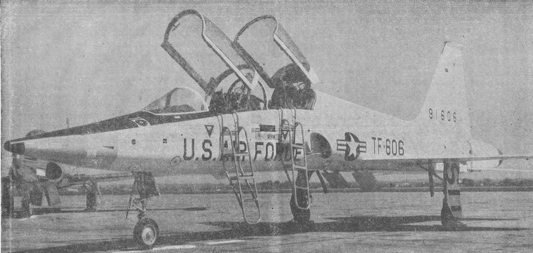 A scanned image from the Wingspread published in 1961 with a photo of the first T-38 to arrive at Randolph Air Force Base, Texas.
