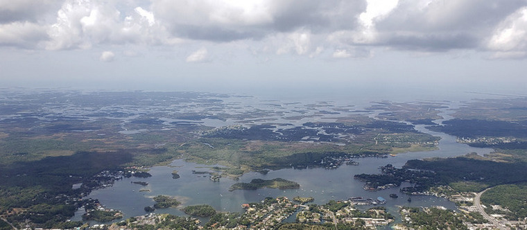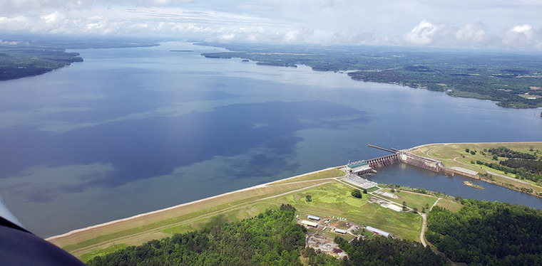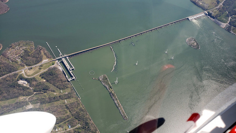 Again, enjoying the great downward visibility thanks to the bubble doors: A dam on the Tennessee River (with a lock and hydro-electric power generation).