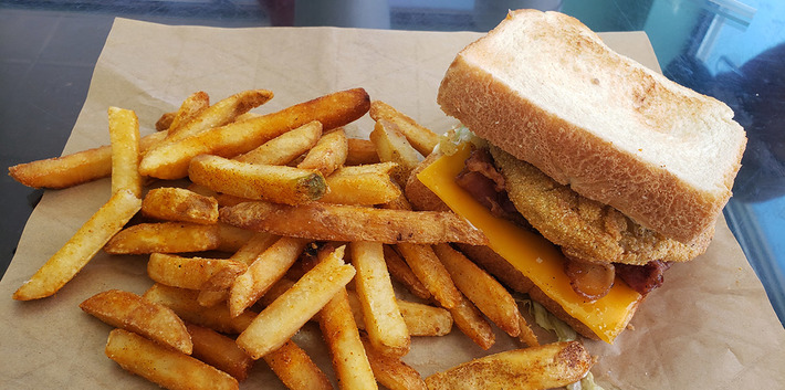 Enjoying southern lunch at Cullman Regional Airport / Folsom Field (KCMD) airport restaurant: BLT with fried green tomatoes