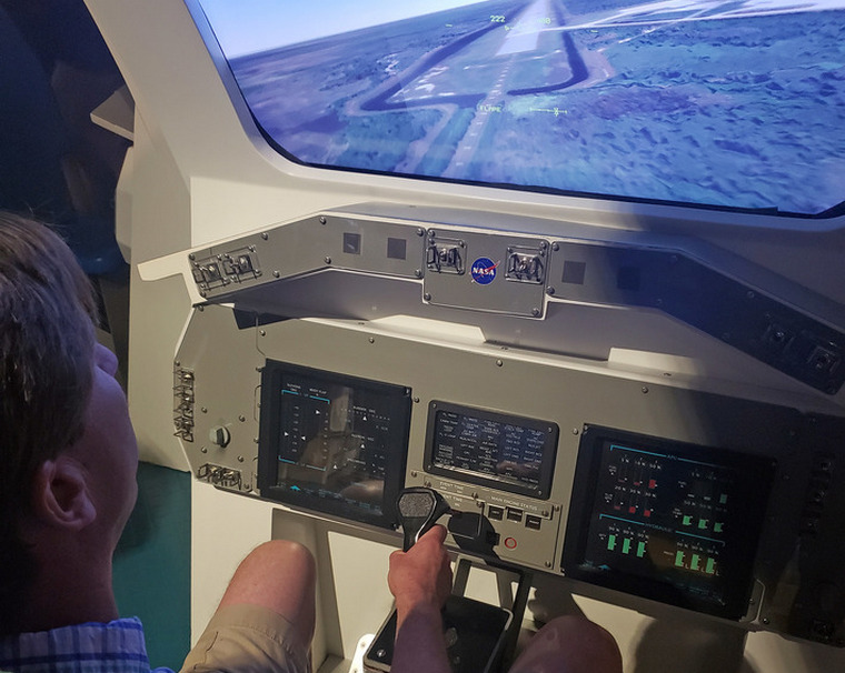 Zenith Aircraft demo pilot Roger Dubbert attempts to land the space shuttle simulator at Shuttle Landing Facility at Kennedy Space Centre