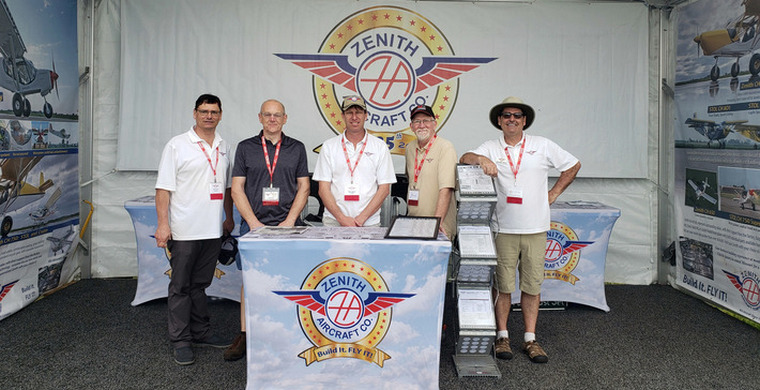 Zenith Aircraft planes at the Zenith booth while the Aeroshell Aerobatic Team and the Blue Angels perform overhead.
