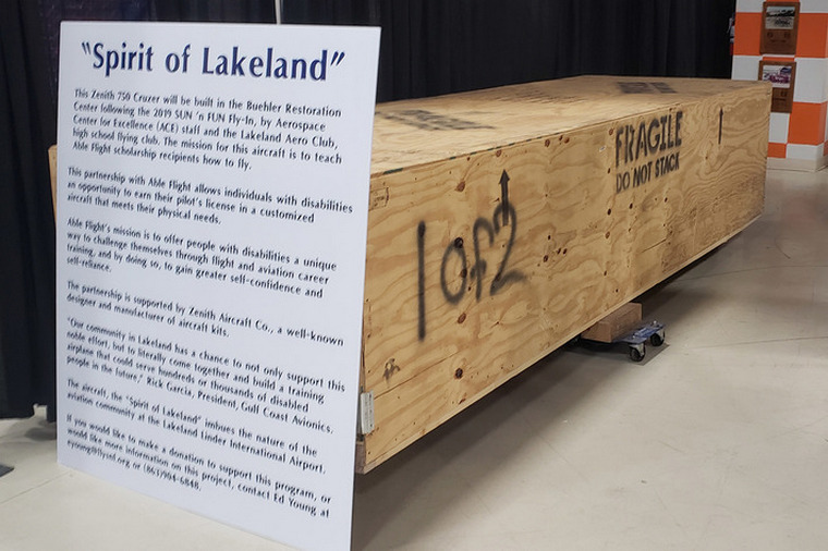 This Zenith CH 750 Cruzer kit (in the crate) will be built in the Buehler Restoration Centre at Sun 'n Fun following the fly-in by the Aerospace Centre for Excellence (ACE) and the Lakeland Aero Club high school flying club. The finished aircraft will be used (in part) to train future Able Flight pilots