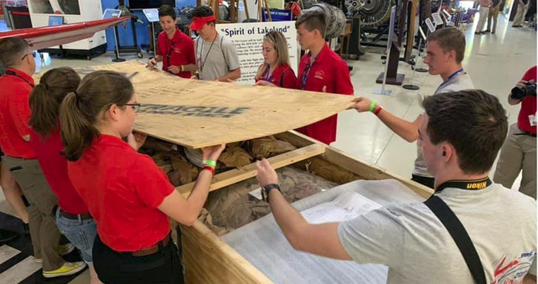 Lakeland Aero Club high school flying club members check out the crated kit that they will be building soon (photo by Andy Ovans)