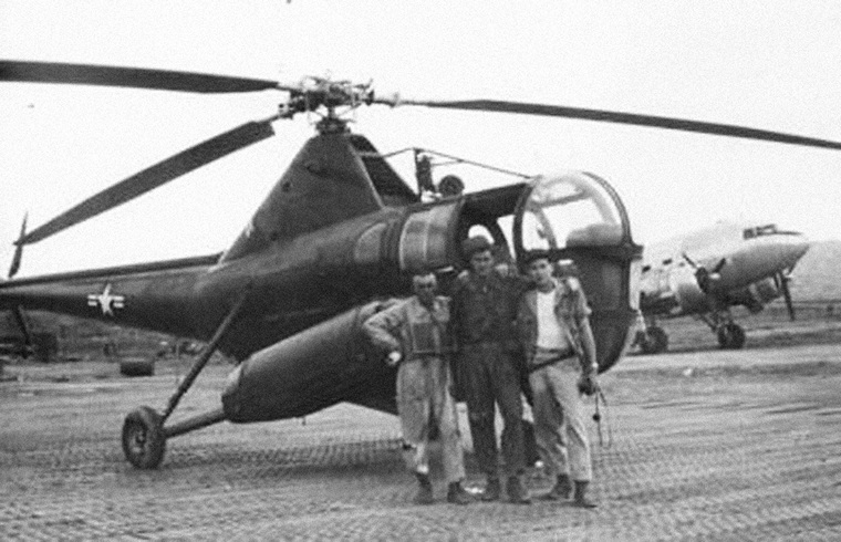 The team that performed the rescue standing in front of the H-5 helicopter used in the rescue - from left, Captain Ray S. White (Capt. Wayne's wing man), 1LT Paul van Boven, Cpl. John Fuentez. Photo Credit: Truman Library