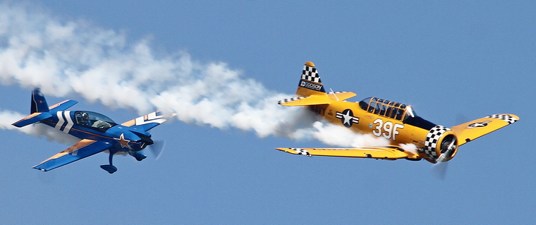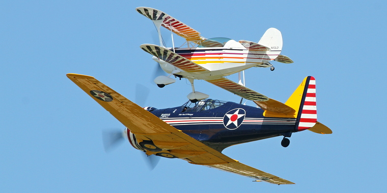 EAA founder Paul Poberezny's North American P64 in close formation with a Pitts Special. Paul passed away in 2013.