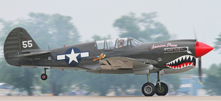 A Curtiss P-40C on its take-of roll. The Warhawk was used by most allied powers during World War II, and remained in frontline service until the end of the war. It was the third most-produced American fighter of World War II, after the P-51 and P-47; by November 1944, when production of the P-40 ceased, 13,738 had been built.
