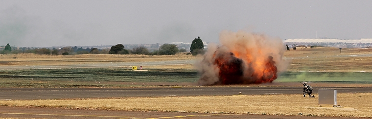 The Airforce museum displayed several of its fixed wing aircraft in a mini war to the delight of the crowd. It was interesting to see the Bosbok equipped with rocket pods as it would have done duty during the Border War. The display included several explosions to simulate a conflict situation as well as the extraction of a downed pilot.