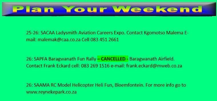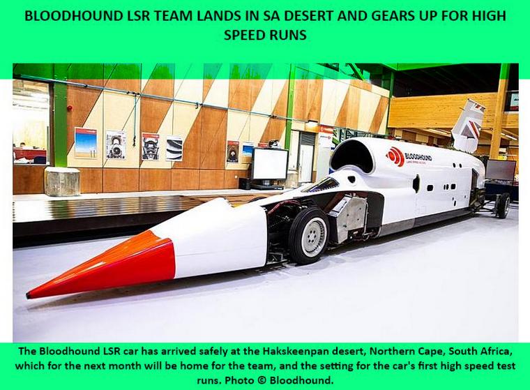 MIDWEEK UPDATE 23 OCTOBER 2019![]() ![]() ![]() ![]() ![]() ![]() ![]() ![]() 30 to 2 Nov: SAPFA Rally Championships - Stellenbosch airfield. Contact Frank Eckard cell: 083 269 1516 e-mail: frank.eckard@mweb.co.za ![]() ![]() 2: SAPFA Rally Championships - Stellenbosch airfield. Contact Frank Eckard cell: 083 269 1516 e-mail: frank.eckard@mweb.co.za 2: Volksrus Breakfast Run. For more information contact Donald Hicks Donald@aqpm.co.za 2: Fete, Parade and Veterans Military Fair to be hosted by Moth Ex-Servicemen's Cottage Association. Moth Ex-Servicemen's Cottage Association, along with MOTH Shellhole, Dickie Fritz, Edenvale. 7-8: SAAMA Safari Cup. Henley Model Airfield. 8-10: EAA Sun n Fun Brits Airfield. For more information contact Marie Reddy 083 259 7691 9: EAA Sun & Fun Adventure Rally - Contact Rob Jonkers e-mail: rob@aerosud.co.za cell: 082 804 7032 15: Wings Park Fly-in. For more information contact Donald Hicks Donald@aqpm.co.za 16: Aero Club of South Africa annual awards. For more information contact AeCSA office 011 082 1100 E-mail: office@aeroclub.org.za 16-17: Wavecrest Fly-in. For more information contact Donald Hicks Donald@aqpm.co.za 22: World Canopy Piloting Championships Wonderboom South Africa. 23: SAPFA Springs Speed Rally - Springs Airfield. Contact Jonty Esser cell: 082 855 9435 e-mail: jonty@promptroofing.co.za 30: The Elders Flight, Rand Airport. SMS Felix Gosher on 066 485 0407 30 to 1 December: SAC Ace of Base Vereeniging Airfield. Contact Annie Boon e-mail: chunge@mweb.co.za ![]() ![]() 18 - 19: SAC Gauteng Regionals Annie Boon chunge@mweb.co.za 25: Rand Airport Challenge Rally - Rand Airport Contact Frank Eckard e-mail: frank.eckard@mweb.co.za cell: 083 269 1516 25: SAPFA AGM - Time: 2 PM Rand Airport Contact Rob Jonkers e-mail: rob@aerosud.co.za cell: 082 804 7032 ![]() ![]() The high-speed tests will see the Bloodhound LSR car blasting along the Hakskeenpan desert racetrack for the very first time, providing a spectacular showcase of British engineering to a global audience. The Bloodhound team's primary objective is to engage and inspire people of all ages through the most extreme application of science, technology, engineering and mathematics. The most powerful straight-line car ever was transported on the same pneumatic tyres as the car ran on in Newquay, and, as well as allowing the car to be manoeuvred on tarmac, they also increase the effective damping of the car, further protecting the car and systems from any shocks during its travels. Unable to stand up to the extreme stresses of high-speed driving, these will be swapped out for precision machined solid aluminium wheels ahead of launch. ![]() Once these narrower wheels, made specifically for desert testing, are fitted, engineers will be able to re-attach sections of carbon fibre composite bodywork to the front of the car, along with the nose section, which is vital for effective aerodynamics. The tail fin will also be fitted, completing the chassis and making the car ready for action. The 25-strong team who flew out with the car joined an advance party who have been working tirelessly beneath the South African sun to set up the 50 x 50 m Desert Technical Camp on the edge of the Hakskeenpan desert. As well as the Bloodhound car itself, it houses a temporary workshop, complete with the precision tools needed to fine tune performance and maintain the car, including a lathe, milling machine and welding equipment. The Bloodhound LSR car was unveiled in all its fully assembled glory on the 21st October, before it begins the high-speed test programme, during which it will build speed gradually in 50 mph increments over a month. The culmination of the four to five weeks will see the car hitting mind-blowing speeds of 500+ mph (800+ km/h). Bloodhound LSR driver and current World Land Speed Record holder Andy Green said: "After years of work to prepare the car, and following almost a decade of preparation of our desert track by the Northern Cape Government, we're delighted to finally be here. The next few weeks will allow us to test the car and train the team, ready for our assault on the Outright World Land Speed Record next year." World's New Straight-Line Racing Track The 10-mile (16 km) desert racetrack has been prepared by 317 members of the local Mier community, funded by the Northern Cape Government. They have moved a staggering 16,500 tonnes of rock from 22 million square metres of dry lakebed - the largest area of land ever cleared by hand for a motorsport event, and testament to the partnership forged between the Bloodhound team, the local community and the Northern Cape Government. ![]() Bloodhound CEO Ian Warhurst explained: "The section of the track we'll use is 16 km (10 miles) by 250 m, with large safety areas on both sides. This allows us to lay out up to 25 individual tracks side by side, if we need them. This is important as we can't run over the same piece of ground twice because the car will break up the baked mud surface as it passes. We need multiple tracks so we can build speed slowly and safely - going up in 50 mph (80 km/h) steps, comparing real-world results with theoretical data - and Hakskeenpan is the perfect place to do this. "The surface is hard, too, which means we've been able to design slightly narrower wheels that reduce aerodynamic drag. The desert surface also has a slight degree of 'give', which will work with the suspension to give a smoother ride, reducing vibration inside the car." The Bloodhound Land Speed Record programme is a UK-based global endeavour exploiting the cutting-edge of digital technologies to set a new World Land Speed Record. By sharing this adventure with a global audience, Bloodhound will help inspire the next generation about science, technology, engineering and mathematics, and will be a supersonic testbed for showcasing emergent digital technologies. Key Facts The Bloodhound LSR car is a combination of fast jet, F1 car and spaceship. The project i