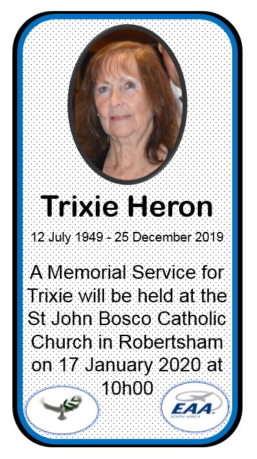 MIDWEEK UPDATE 8 JANUARY 2020![]() ![]() ![]() Dear Aero Club Member, it is the Aero Club & Member Association renewal time for the year 2020. Many thanks for your continued support for recreational aviation in South Africa. The year 2020 is a significant year being the Centenary of the Aero Club and we will take the opportunity to bring to the fore the importance that recreational aviation has for the growth of aviation in SA, particularly poignant in preserving our free flight while working with the regulator transitioning from the domain of RAASA to the CAA and the regulatory changes that it brings. We will keep you posted on the overall status & progress. To renew your membership or join the Aero Club and its Sections, go to https://www.aeroclub.org.za/member-renewals-and-new-memberships/, where you can use the Aeropay System, or you can pay via EFT. If you have any difficulties, please contact the Aero Club office by email or phone as given below, Sandra & Charne are ready to assist. The Aeropay System Visit the Aero Club website on www.aeroclub.org.za Click on Memberships and then on the Aeropay link Log in to your membership and follow the steps Once your payment is processed you can download or print your Membership certificate and Tax invoice. Electronic Funds Transfer (EFT) The Aero Club of South Africa Standard Bank Acc: 202506231 Branch: 001155 Midrand Reference: Your Name and Surname Send proof of payment to: sandra@aeroclub.org.za The Aero Club of South Africa Tel : 011 082 1100 Fax : 086 635 3755 E-mail : office@aeroclub.org.za ![]() ![]() ![]() ![]() 8: Chapter 322 Meeting. Dicky Fritz Moth Hall, Edenvale. ![]() ![]() 25: Rand Airport Challenge Rally - Rand Airport. Contact: Frank Eckard e-mail: frank.eckard@mweb.co.za cell: 083 269 1516 25: SAPFA AGM - Time: 2 PM Rand Airport. Contact: Rob Jonkers e-mail: rob@aerosud.co.za cell: 082 804 7032 ![]() ![]() 1: Witbank Speed Rally - Witbank Airfield. Contact: Jonty Esser e-mail: jonty@promptroofing.co.za cell: 082 855 9435 5: Chapter 322 Meeting. Dicky Fritz Moth Hall, Edenvale. 7 - 9: SAPFA Committee Bosberaad - Paddafontein. Contact: rob@aerosud.co.za Cell: 082 804 7032 29: Rally Navigation Training Course - Venue Aerosud. Contact: Mary de Klerk e-mail: maryd@expandingbranding.co.za cell: 084 880 9000 ![]() ![]() 4: Chapter 322 Meeting. Dicky Fritz Moth Hall, Edenvale. 7: Brakpan Fun Rally - Brakpan Airport - Contact: Frank Eckard e-mail: frank.eckard@mweb.co.za cell: 083 269 1516 7-8: SAC KZN Regional Aerobatics. Ladysmith Airfield. Contact Annie Boone: chunge@mweb.co.za 21: Bethlehem Speed Rally - Bethlehem Airfield - Contact: Jonty Esser e-mail: jonty@promptroofing.co.za cell: 082 855 9435 21: The Airplane Factory Fly-in, Tedderfield. Contact: Shanelle 011 948 9898 21-22: Fashkosh Airshow Stellenbosch Airfield. Contact: Anton Theart at gm@stelfly.co.za or 079 873 4567 13 to 5 April: Sun 'n Fun, Lakeland Florida USA. Contact: Neil Bowden at Neil1@telkomsa.net or on 084 674 5674 ![]() Obituary: Trixie Heron 12 July 1949 - 25 December 2019 ![]() There is hardly any member of the local recreational aviation community who did not know Trixie and her unbridled enthusiasm for EAA. It is true to say that EAA was the centre point of Trixie's life and had been so for at least the last 17 years and never missed a single meeting. She loved the EAA community, animals and younger people and music. Trixie was born in Humansdorp in the Eastern Cape with the surname of van Rooyen and grew up as an Afrikaans speaker at school in Port Elizabeth. She married George Heron a fine sportsman who lived in Rhodesia. She also lived in the UK and Saudi Arabia where she worked for the Royal Saudi family as a tutor. Trixie was a rabid vegetarian and teetotaller - she had the moral conviction of her love for all animals and vowed never to eat anything that had eyes. She was often referred to by Ricardo De Bonis as 'The Rabbit' at our frequent and happy braais at his hangar at Krugersdorp when she'd bring her own salad or pasta. She was an accomplished pianist. Wherever we went on EAA events and a piano was present, Trixie would tickle the ivories. She earned a stipend at many weddings and church functions playing the piano, this being one of the ways she made a meagre but honest living. Trixie was a copy writer as her main occupation and did proof reading for some large companies' advertorials. Nothing in the world is more common than unsuccessful people with talent. Trixie was an aunt of the late Terry Hertz who was EAA of SA National Chairman in 2003. She was an erstwhile member of MISASA when she owned and was learning to fly her microlight Trike. For a while, she published her glossy African Skies magazine which focussed mainly on the microlight fraternity. She often spoke of the Microlighters' annual fly-ins to the Numbi Hotel airstrip at Hazey View. Her plane was damaged in a tornado which collapsed a hangar that destroyed several Trikes badly damaging others, including hers, which has not flown since. I spent many years compiling the EAA newsletter which we named '…brakes on, throttle set, CONTACT!' Trixie would come to my home the week prior to our Chapter 322 monthly meetings to proofread my work so that the newsletter could be distributed punctually with a reminder in time for the upcoming meeting. The proof reading was an immense task as she was an absolute stickler, almost to the point of pain, for accuracy of spelling and grammar. Her language proficiency in English, Afrikaans and French as well as Arabic was impressive. Trixie was loath to be elected to any EAA Committee although she did act as secretary on occasion and attended most EAA Committee meetings of both Chapter 322 and the EAA of SA Council. Trixie will be remembered too for handling registrations as well the sales of EAA regalia at countless EAA events that she would get to in EAA members' planes or cars. She kept a ledger of all members and guests at 322 meetings and was i