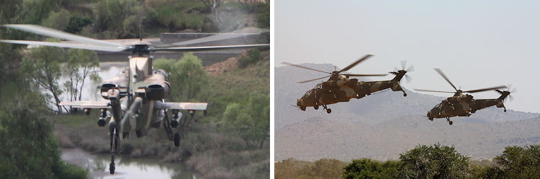 I felt comfortable flying the Rooivalk right from the start. With the pilot elevated above the WSO, both crew members have an excellent view. The controls are light, responsive and you can feel the solidity of the platform with every movement you make. Other controls and systems are all either on the flight controls or in close reach and in most cases there is no need to move your hands around. When you need power it is always available and the harmony between bank and yaw is so good that only cyclic movements are required during moving turns and very little anti-torque input is required. The hover is just as sturdy as the platform. With the huge amounts of power available there is hardly a requirement for any collector input and gently reacting to change with only the cyclic makes the hover an easy task. A sideway taxi is equally simple and the unobstructed view through the side window allows this manoeuvre to be as natural as forward flight with the difference that you can do it at significantly high speed. All of these features are of course extremely valuable considering that this will be most of the Rooivalk's requirements as they pounce the enemy while flying low, slowly and most of the time inside river beds or between trees to remain undetected. But when speed becomes a requirement and power to climb fast, the Rooivalk doesn't fail to impress. It is actually astounding to fly in so many different configurations and environments and still doing it without effort or compromise.