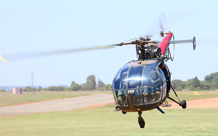 SAAF Museum Alo III transitions from hover to forward flight in a training sortie.