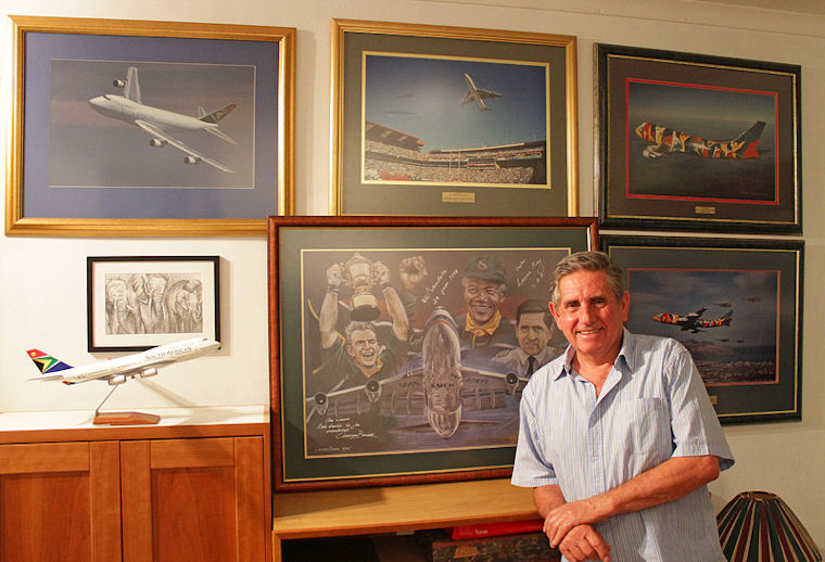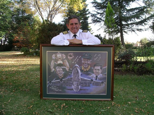 A painting of President Nelson Mandela, Laurie Kay Francois Pienaar and the Boeing 747 to was painted by Chrito Bekker to mark the occasion. The painting was signed by all except Francois Pienaar. Even the 747 made its mark by taxing over the bottom right corner with a paint splattered nose wheel. Laurie proudly displays a copy of this painting in his study at his Glen Austin home.