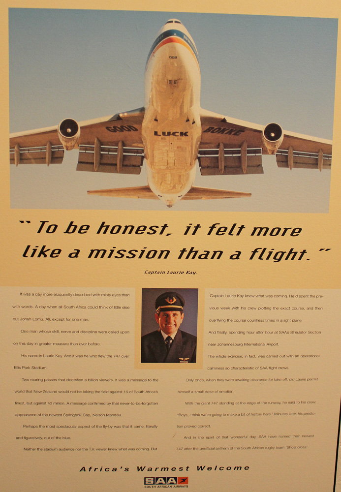 In 1995 an event took place that resulted in Laurie becoming a household name. Rugby World Cup fever overtook South Africa and the Springboks made it all the way to the final. SAA decide to join the Nation Building effort by allowing Laurie to do a low level pass over the Ellis Park stadium as part of the closing ceremony. “GOOD LUCK BOKKE” was stenciled on the underside of the Boeing 747, the fly-past was kept secret and the whole world was surprised as the aircraft came over the stadium and powered up making it a total sensory experience for all present. We believe this was the first such display ever attempted in the world. Laurie was joined on the flight deck by Senior First Officer Billy Fourie, Senior Flight Engineer Don Coppard, Senior Training Captain Selwyn Thomas, who was responsible for getting the time over target correct and they all did an impeccable job.