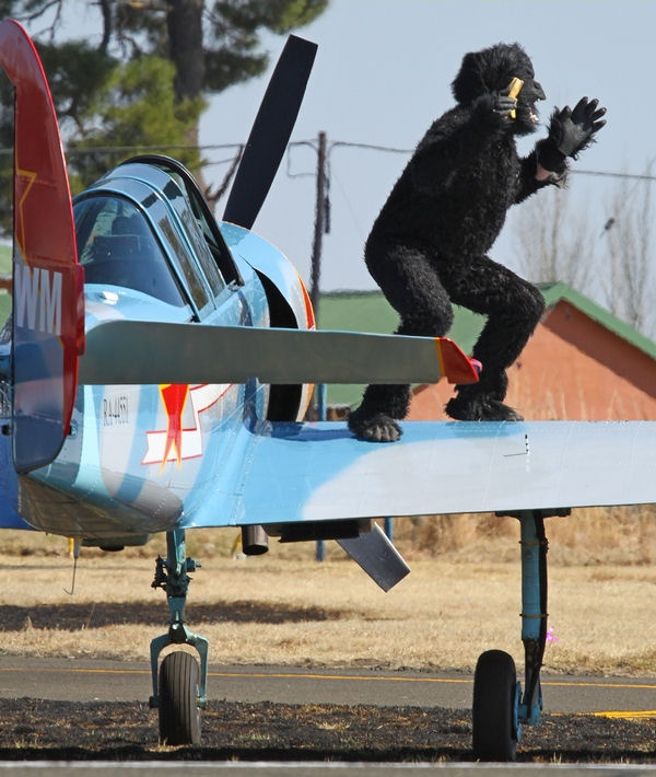 Dave never forgot the crazy flying act and how the children that watched it in awe enjoyed it. “At air shows of late there was nothing for the kiddies and so the gorilla from the zoo act was born. The Gorilla steals my Yak and after some crazy flying returns in a cloud of smoke to be brutally arrested by the SAPS, blue lights and sirens going whilst the Gorilla throws bananas at his attackers and gets assaulted by hundreds of kids with plastic machine guns. I have heard the kids love it although I wouldn't know as I always end up being thrown into the back of a police to be carted off to a maximum security prison. But I must say I always look forward to the next time.” Dave said smiling.