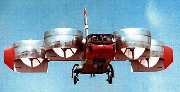 With the team's ever-pioneering spirit, Bell was already developing a similar prototype. This aircraft flew with three blade propellers mounted on four wings connected to four gas turbines which, in turn, were mounted in pairs on the rear wings. Maneuvering was achieved by tilting the propeller blades in combination with control surfaces (elevators and ailerons), which were located in the thrust stream of the propellers.
