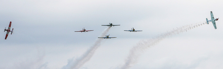 Most pilots were back for the second or third time, but there were two first timers as well. After the week of training, an excellent ten ship formation was flown. This formation then displayed during the Air Show. Virginia was abuzz with flying for the whole week. In the beginning, it was sorties of Yaks going out several times a day to practice formation flying in smaller groups. The Silver Falcons arrived and then aircraft started arriving for the air show. On Friday, validations were flown for the weekend's air show on the 12th and 13th.