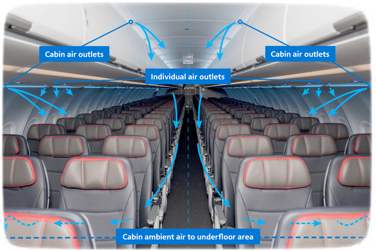 Cabin air is filtered from the top down, so be sure to open the overhead vent to let the filtered air flow on your next flight. As air is pushed downward, it re-enters the filtration system along the walls of the aircraft and repeats the filtration process, mixing outside air with filtered air.