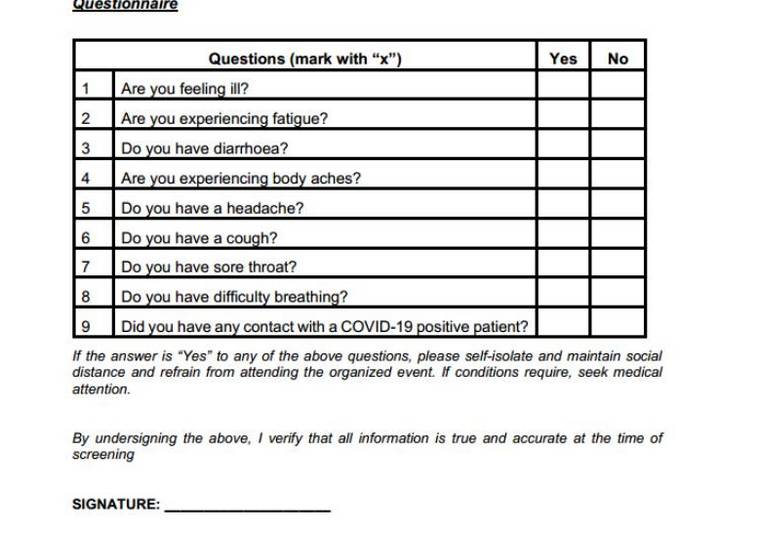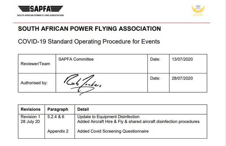 MIDWEEK UPDATE 12 AUGUST 2020![]() ![]() ![]() ![]() ![]() COVID 19 REGULATIONS, INITIATIVES AND AEROCLUB NEWS SACAA CLIENT SERVICES WALK IN COLLECTIONS BOOKING TOOL ANNOUNCED The collections will be managed as follows: License collection (Midrand) - Walk-in collections will be permitted on Monday, Wednesday and Friday. All walk-in clients must have a confirmed booking and must produce the attached confirmation - Time slots will be between 10h00 and 15h00 - 5 walk-in clients will be scheduled every 30 minutes to minimise the number of walk-in clients - Courier companies will not be required to make bookings for collection - Bulk-clients and operators may collect on Tuesday and Thursday. No bookings will be required for these clients as we will be able to manage the numbers. Certificate Collection (Midrand) - Walk-in collection will be permitted on Wednesdays. All walk-in clients must have a confirmed booking and must produce the attached confirmation - Time slots will be between 10h00 and 15h00 - 5 walk-in clients will be scheduled every 30 minutes to minimise the number of walk-in clients - Courier companies will not be required to make bookings for collection - Bulk-clients and operators may collect on Tuesday and Thursday. No bookings will be required for these clients as we will be able to manage the numbers. Certificate and License (Rand Office) - Walk-in collection will be permitted on Monday, Wednesday and Friday. All walk-in clients must have a confirmed booking and must produce the attached confirmation - Time slots will be between 10h00 and 15h00 - 3 walk-in clients will be scheduled every 30 minutes to minimise the number of walk-in clients - Courier companies will not be required to make bookings for collection - Bulk-clients and operators may collect on Tuesday and Thursday. No bookings will be required for these clients as we will be able to manage the numbers. The above measures will be adjusted as when there are required changes. Colleagues, I look forward to your feedback and further input on the process. Regards Ayanda Manunga ![]() SOUTH AFRICAN POWER FLYING ASSOCIATION COVID-19 Standard Operating Procedure for Events ![]() 1.0 Purpose...................................................................................................... 2 2.0 Scope ......................................................................................................... 2 3.0 Definitions and Abbreviations .................................................................. 2 4.0 Resources / Responsibilities.................................................................... 2 5.0 Methodology / Procedure.......................................................................... 3 5.1 Registration ................................................................................................. 3 5.2 Procedures to follow at the Airfield / Event................................................... 3 6.0 Distribution List......................................................................................... 3 Appendix 1: ........................................................................................................... 4 Appendix 2: ........................................................................................................... 5 1.0 PURPOSE The purpose of this document is to provide a structured and scientific approach to the containment of the Coronavirus which developed into a worldwide pandemic after the first outbreak was noted from China in December 2019. Therefore, as part of a continued effort to provide healthy and safe practise of aviation sporting events, SAPFA will implement, reasonable practicable measures to reduce the risk of the highly contagious virus. This document will further highlight ways to manage conditions and thereby assisting to curb the transfer of the virus to healthy and uninfected persons and persons with known or disclosed health issues or comorbidities. 2.0 SCOPE The procedure applies to all SAPFA members, participants, visitors and spectators at any of the SAPFA events. 3.0 DEFINITIONS AND ABBREVIATIONS The abbreviations applicable to this document are listed below: Common Contact Area: Area that are commonly touched by more than one person such as door handles/knobs, kettles, fridge handles, telephone, kitchen appliances, computers, etc. PPE: Personal Protective Equipment. SOP: Standard Operating Procedure. 4.0 RESOURCES / RESPONSIBILITIES SAPFA Committee Members will be responsible for the overall management of the COVID19 readiness in terms of this procedure. Committee members or competent designated persons will be responsible for the implementation of the procedure at any of the SAPFA events/meetings. This Designated Person / Compliance Officer would in general also be the Safety Officer for the event. No more than 50 persons will be allowed to attend the event. 5.0 METHODOLOGY / PROCEDURE 5.1 Registration 5.1.1 Online registration. Participants would register online on the SAPFA website portal for their flight. This will ensure records of activity on the particular event day. Only after registration would they be granted access to their stated airfield where the event is to take place. 5.1.2 C-19 Compliance Officer. Each event will have an appointed compliance / safety officer ensuring additional adherence to operating procedures. The Compliance / Safety Officer shall set up a cleaning station (if applicable), if it is decided that the event shall have a hygiene station, comprising a small table and with either a spray or washable disinfectant, which is compliant with Government protocols. 5.1.3 Arrival at site Report to compliance /safety officer and complete register/ record temperature and complete screening protocol. Any person exhibiting inflated temperatures (above 37.5 Deg C) or exhibits flu like symptoms to be denied access to the Airfield / Event. 5.1.4 Declaration: Each person associated with the event must sign a declaration s