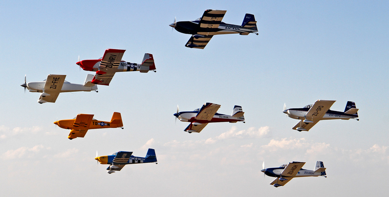 Eight of the more than 1,500 Rv8s built flying in formation overhead Kitty Hawk. Photo Garth Calitz.